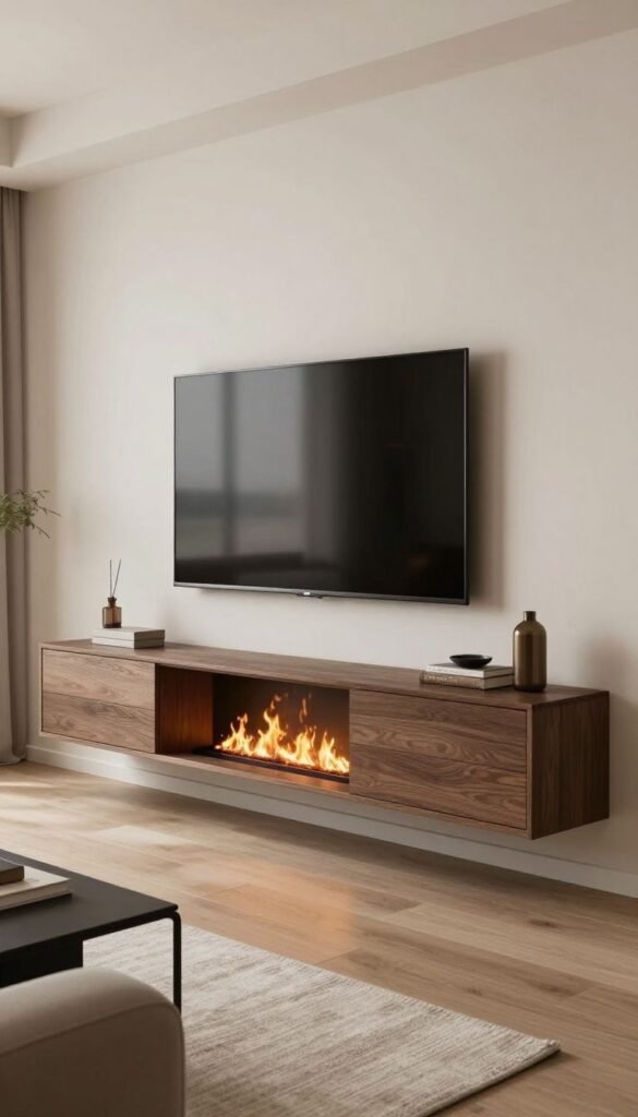 Let your storage levitate. A floating console with an integrated fireplace adds warmth and room for devices without bulky furniture.