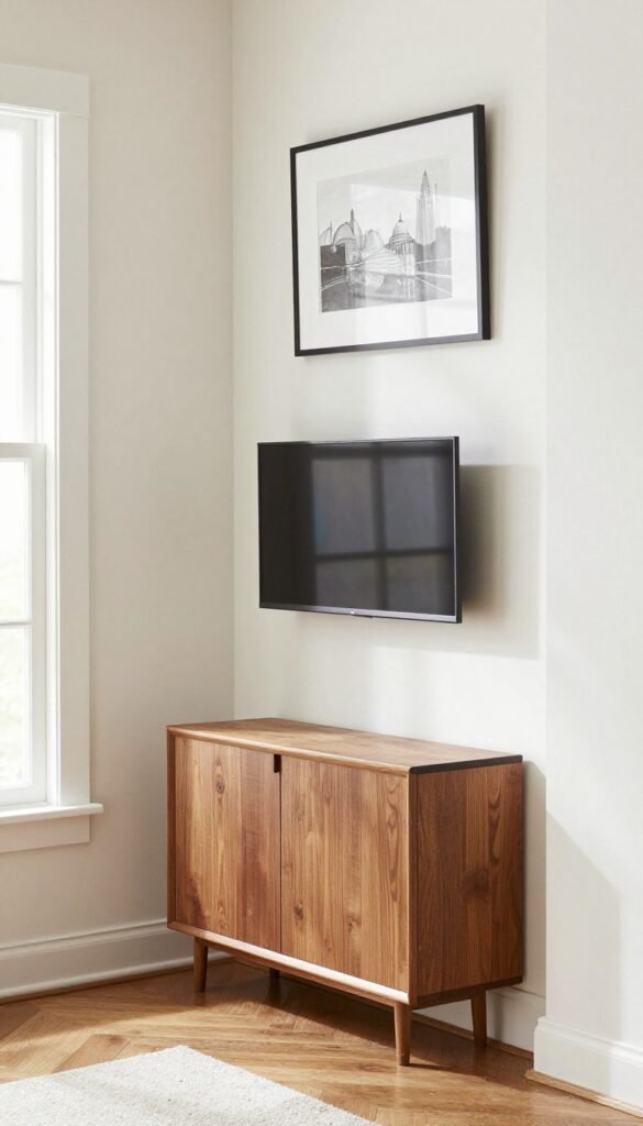 Pro tip: Use a triangular cabinet to hide devices. It works because corners become cozy, not awkward.