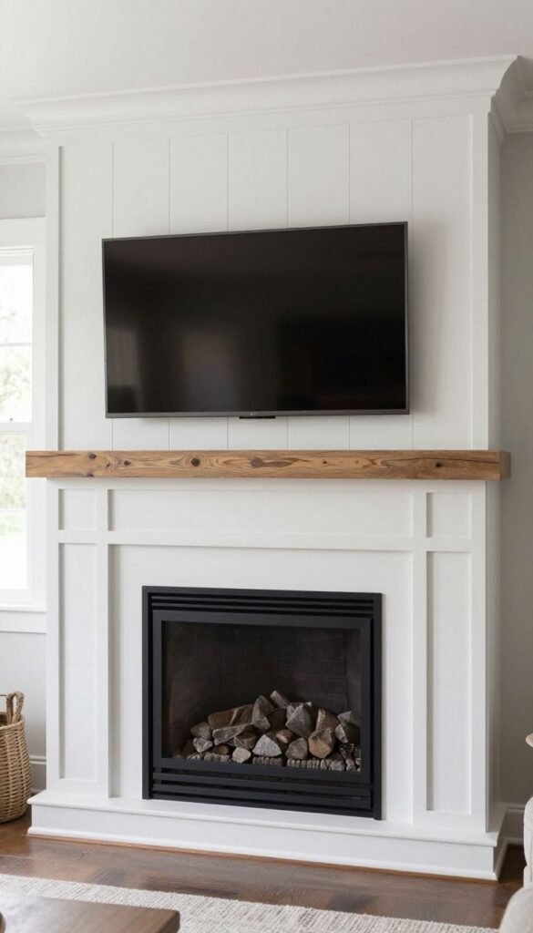 Rustic but polished. Vertical shiplap frames the fireplace while the TV sits centered above.