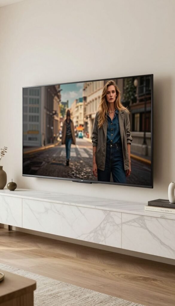 Gallery feels, Netflix reality. A frame-style TV over a marble or porcelain slab looks curated.