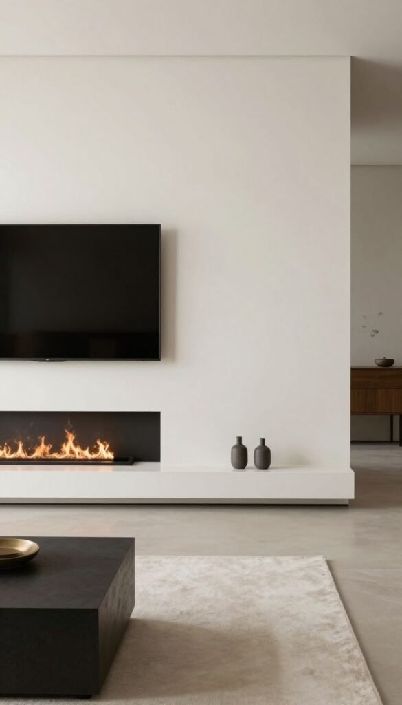 Ultra-clean and calming. A smooth slab in plaster, microcement, or quartz sets a gallery mood with TV and fire aligned.