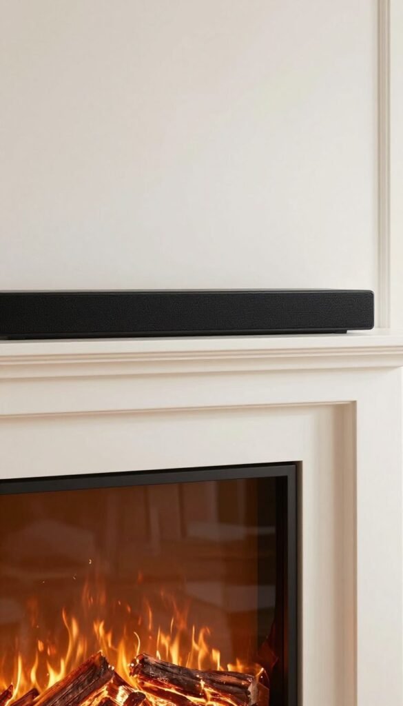 Hide the tech, keep the sound. A slim mantel ledge conceals a soundbar while framing the fire.
