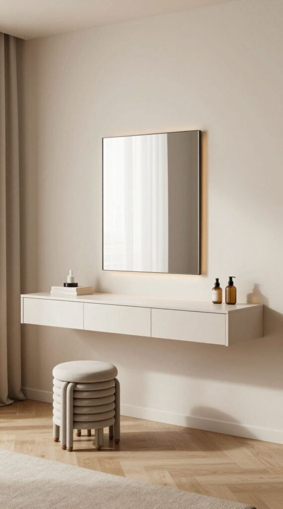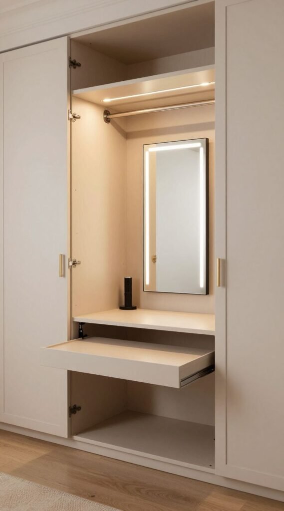 Secret glam bunker, unlocked. Tuck a pull-out table and a flip-up mirror into a wardrobe bay with interior LEDs. Close the doors and itโs gone.
