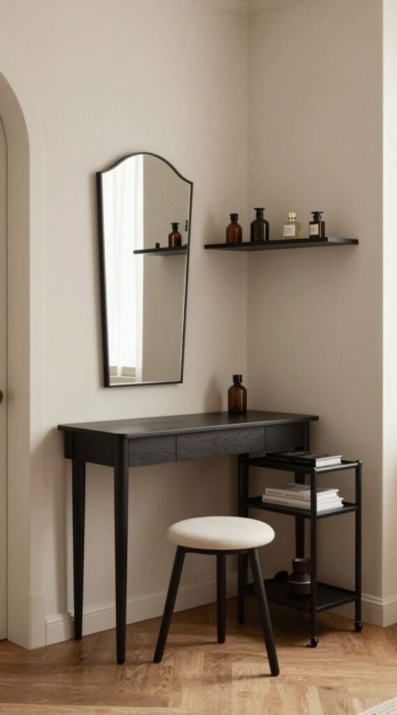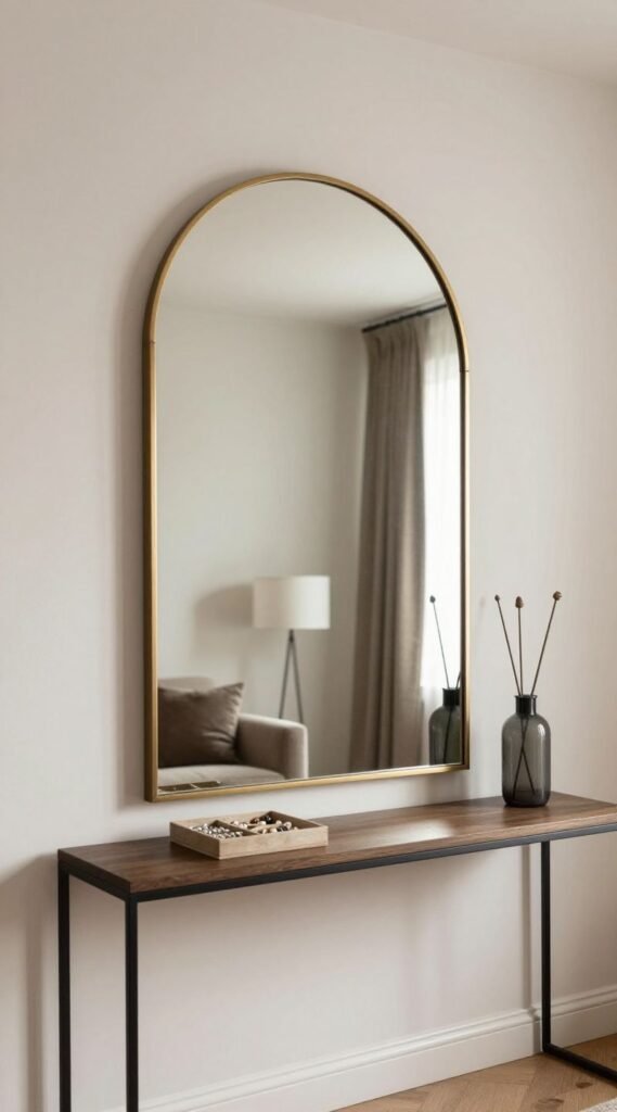 Curves soften the space and make your setup feel luxe. An oversized arched mirror with a slim console table screams quiet elegance. Add a jewelry tray and a bud vase for polish.