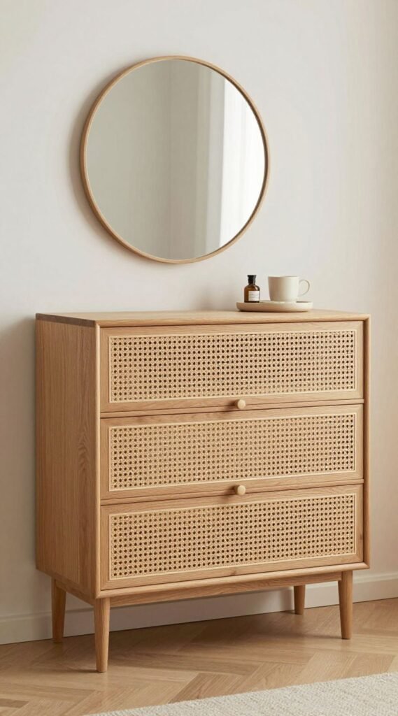 Light oak, rattan cane fronts, and soft linesโhello calm mornings. This combo adds texture without cluttering visuals. Use tapered legs and a round mirror for balance.