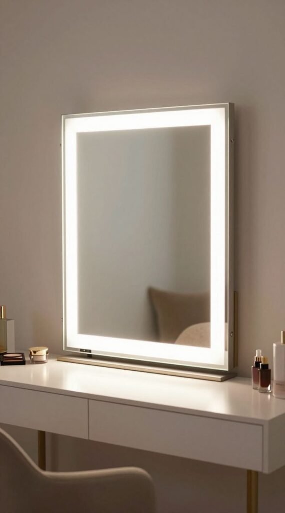 Get that soft-focus movie-star lighting without harsh bulbs. A backlit LED mirror gives even illumination and zero shadows. Keep the table glossy for a subtle light bounce.