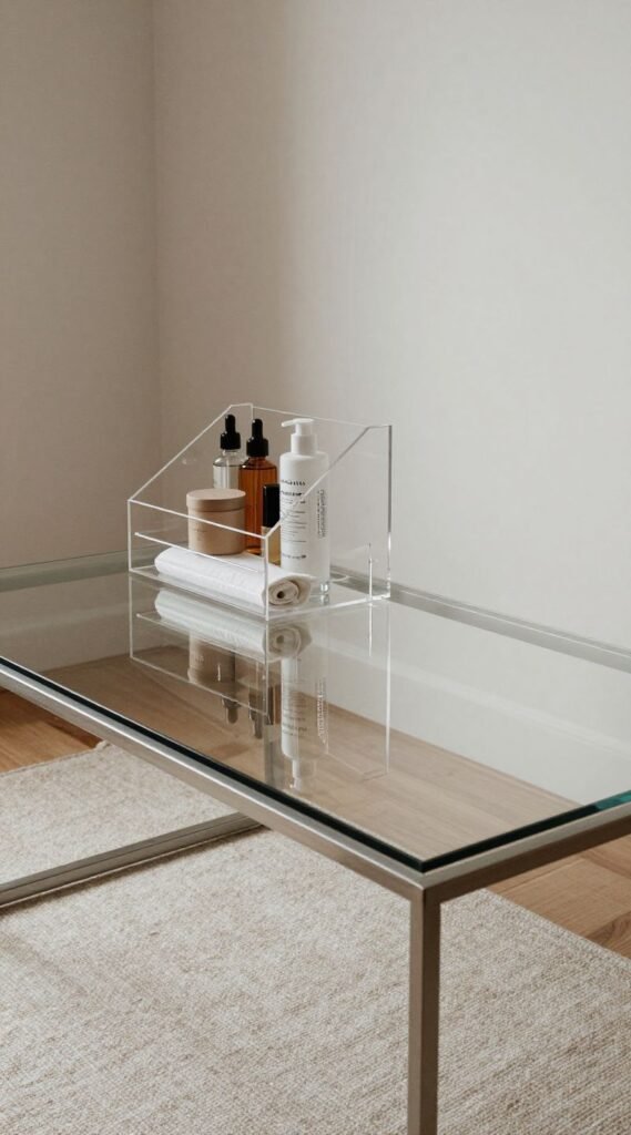 See-through surface, zero visual bulk. A glass top over a slim metal frame keeps things airy, while a clear acrylic organizer corrals daily essentials.
