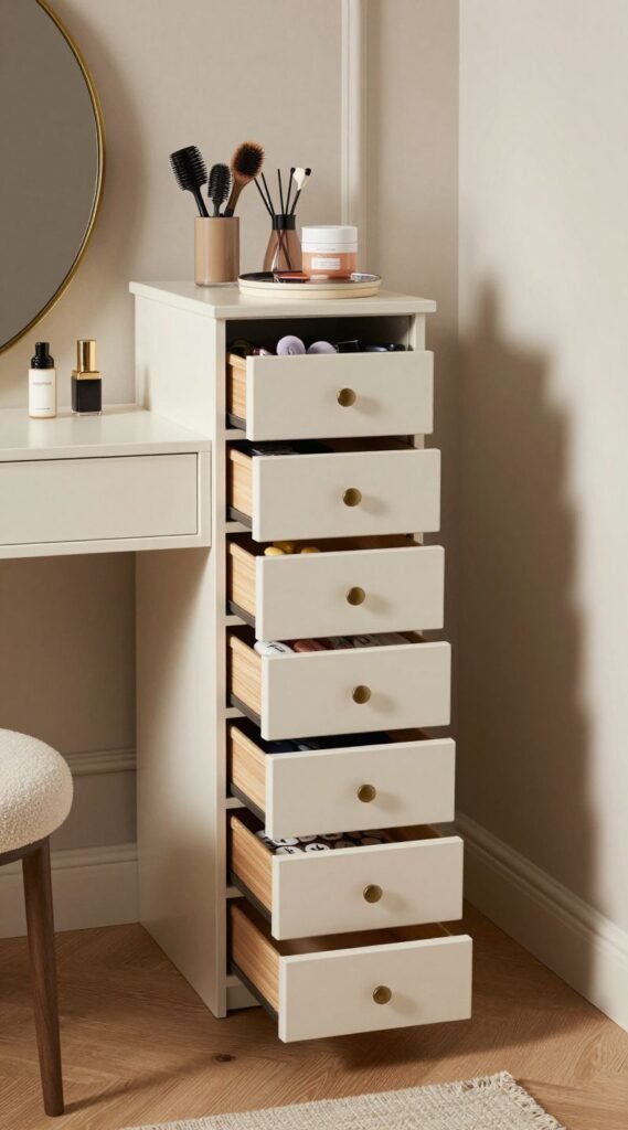 Beauty stash bigger than your patience? Go vertical. A compact tabletop plus a pull-out drawer tower handles tools, palettes, and hair gadgets.