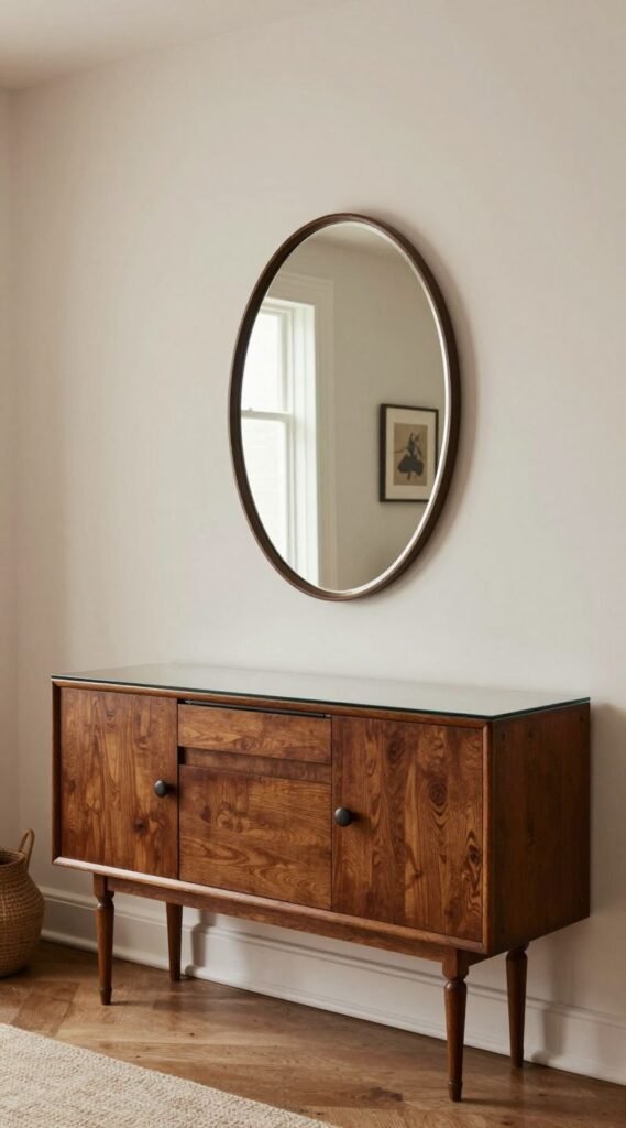Old soul, new tricks. Refurbish a vintage console with new hardware and a modern oval mirror. Keep patina; swap in soft-close slides for function.