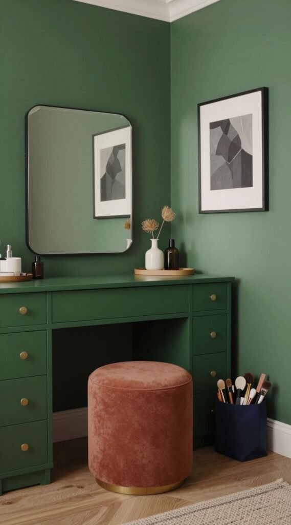 Neutrals are cute. But a saturated hunter green, navy, or terracotta vanity turns the corner into a statement. Balance with a simple mirror and soft lighting.