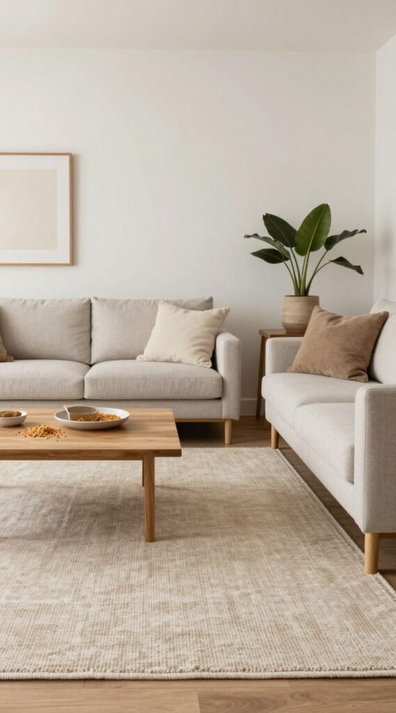 Layer in structure with rugs that define zones. A large neutral rug under the sofa area and a flatweave under the table keeps crumbs in check and vibes in place. Itโs like drawing invisible wallsโฆ but soft.