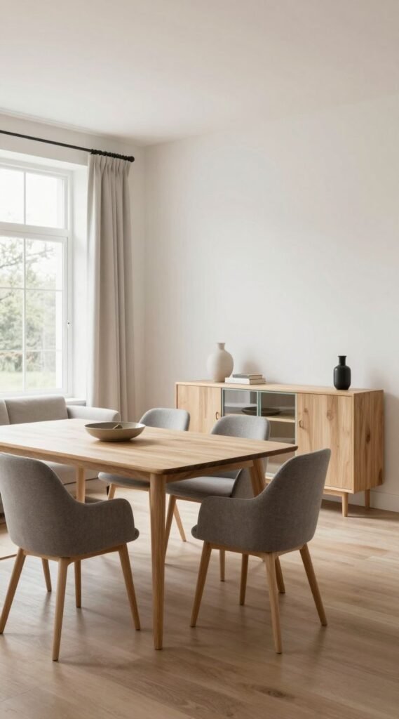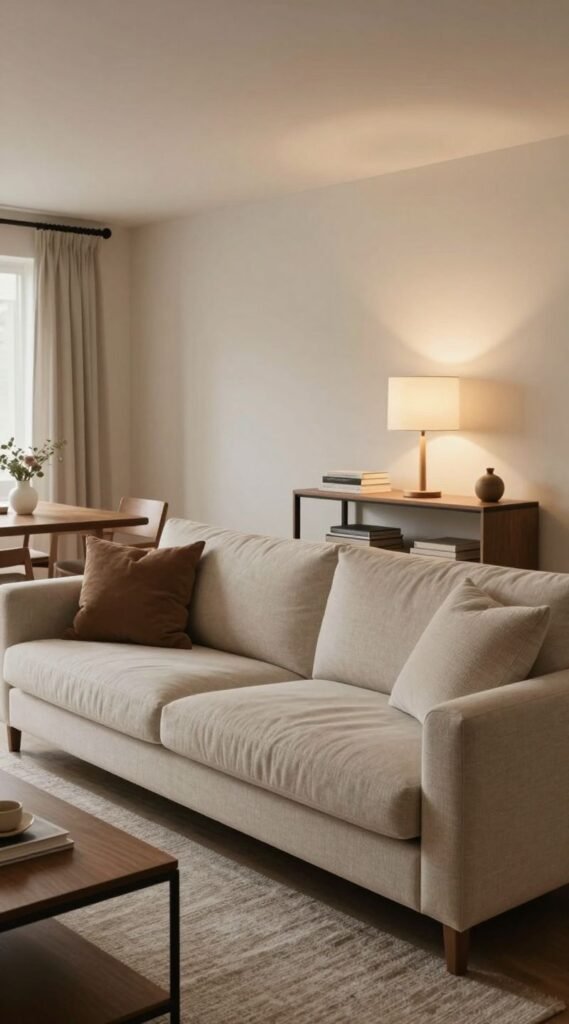 Choose pieces that donโt bulldoze the room. Go for a slim-profile sofa, open-leg dining chairs, and a narrow credenza. Clear glass or light wood helps the space feel bigger.