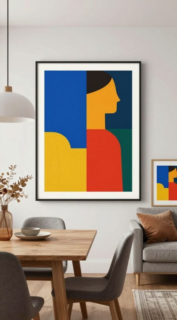 Let your art create the conversation. Place a bold large-scale piece in the dining area and echo its colors with smaller prints near the sofa. Think complementary, not matchy-matchy.