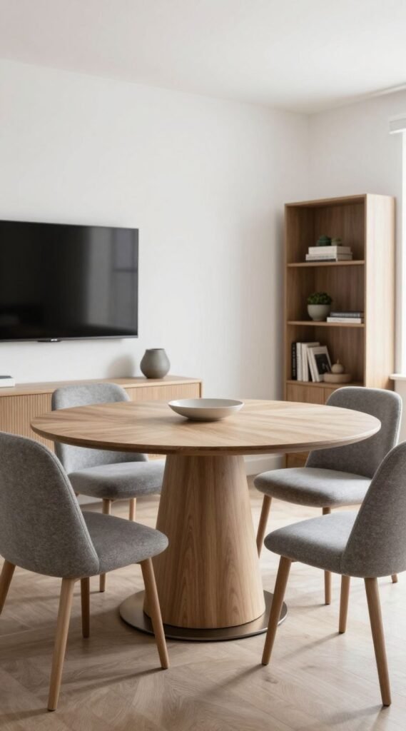 A round dining table saves space and keeps walkways easy. It softens the hard angles of a TV unit or bookcase and invites conversation. Choose a pedestal base for more legroom.