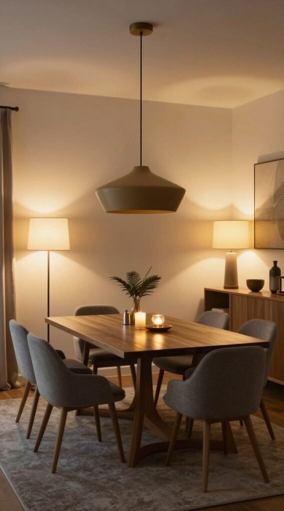 Give each zone its own vibe with layered lighting. A statement pendant centers the dining area, while floor lamps and table lamps handle the lounge. Put them on dimmers for easy mood shifts.