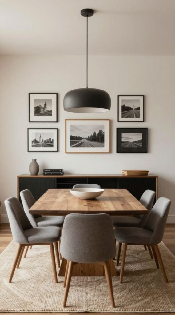 Balance both zones without making them boring. Try a gallery wall mirroring the width of the dining table and a media unit matching the sofa length. Keep the symmetry soft with varied frame sizes.