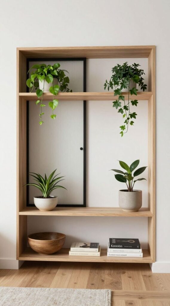 Define the zones with a low open shelf or a sliding screen that doesnโt kill light. Style it with plants, bowls, and books so it looks purposeful from both sides.