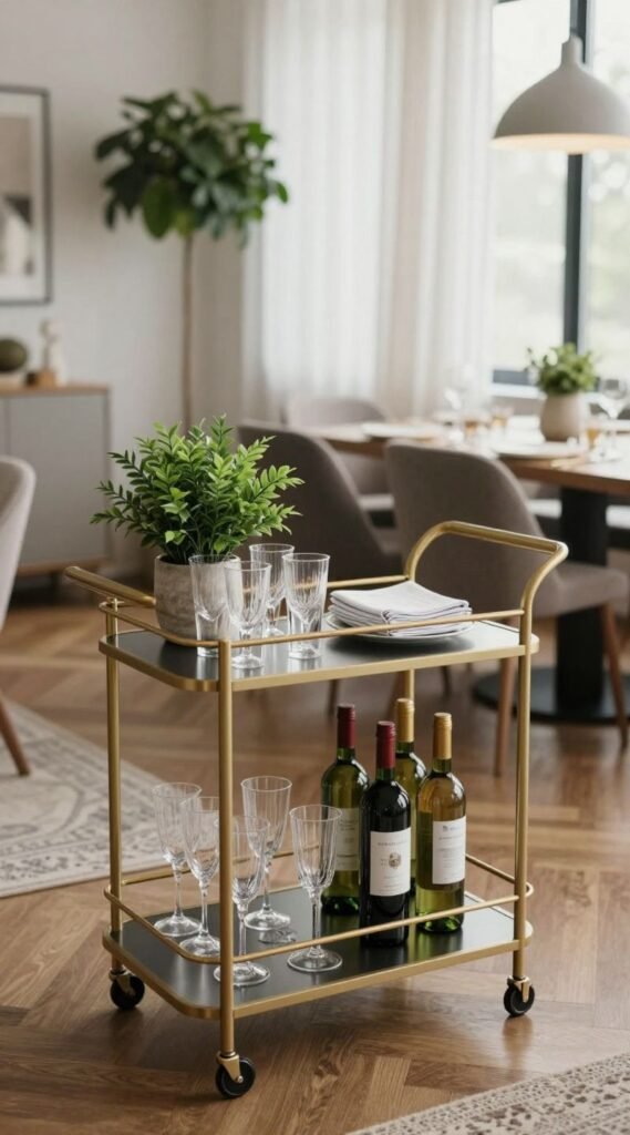 Use a bar cart between areas to transition from lounge to dining. Style with glassware, a plant, and napkinsโparty central, minus the mess. Wheels mean instant flexibility.