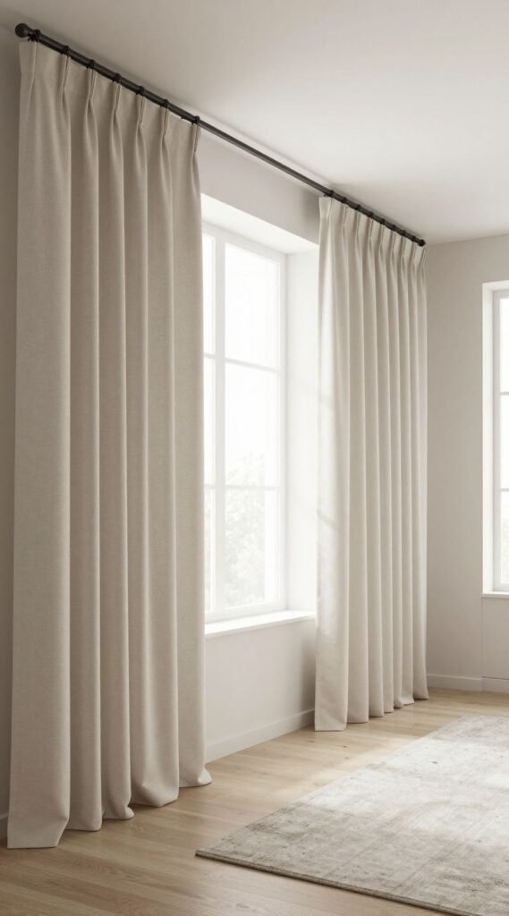 Hang curtains wide and high across one long wall to expand the room visually. Even if thereโs only one window, extend the rod to make the wall feel seamless. Choose a soft neutral for calm.