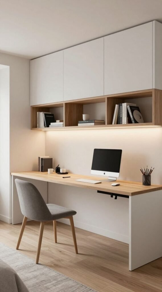 Turn bedtime into grind time without losing square footage. A loft with a full-length built-in desk and task lighting gives you a sleek mini office. Add floating shelves for books and a cable tray to hide the chaos.