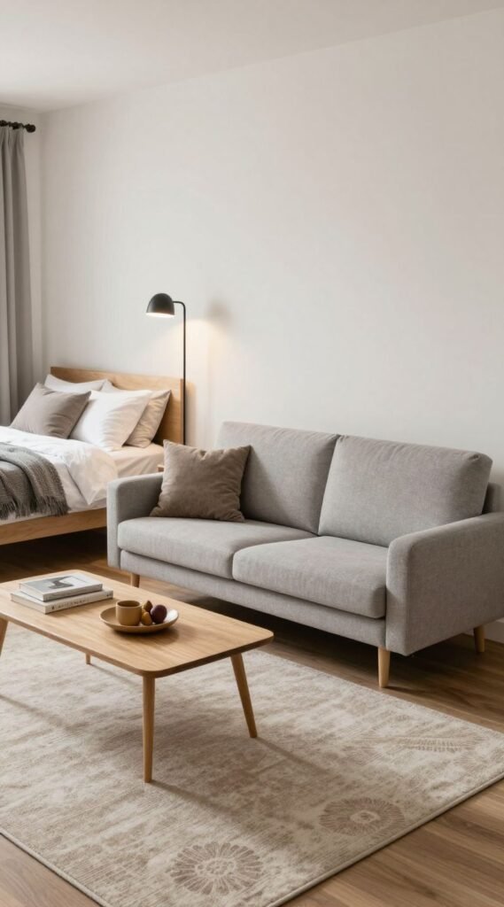 Put the party under the bed. Slide in a compact love seat, a low coffee table, and a skinny floor lamp for instant hangout vibes. A soft rug warms it up and zones the space.