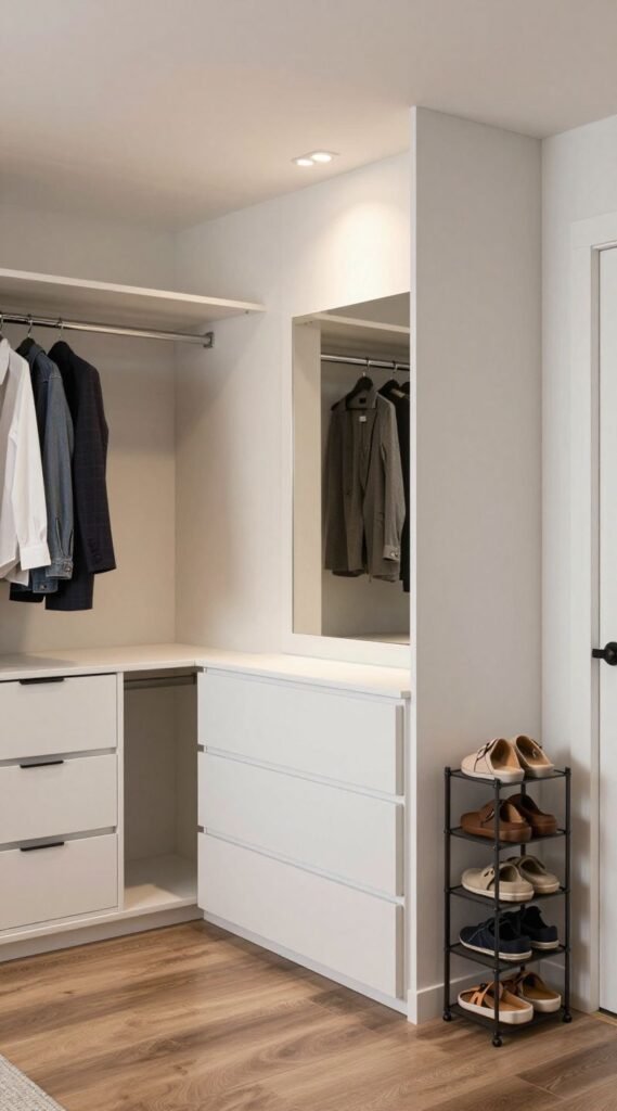 Swap a dresser for a full-blown wardrobe. Install closet rods, drawer cubes, and a slim shoe tower under the loft. Add a mirror on the end panel for a dressing zone.
