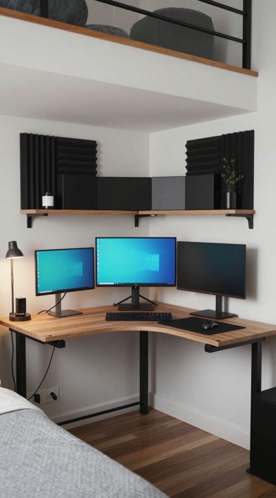 Stack your setup like a pro. A corner desk, monitor arm, and wall-mounted console rack fit perfectly under a loft. Add acoustic panels to keep the rage-quits private.