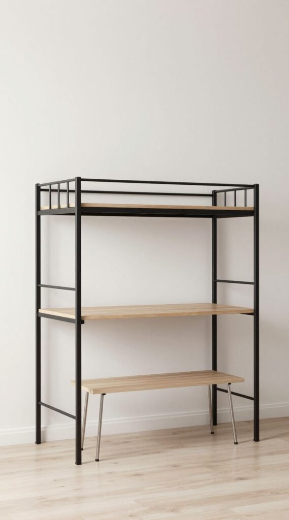 Clean lines, max airflow. Choose a slim metal loft frame with open sides to keep sightlines wide. Pair with light neutrals and a small folding desk or bench below.