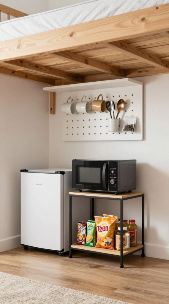 Turn under-bed space into a snack-ready hub. Add a mini fridge, bar cart, and a slim microwave shelf. Keep a pegboard for mugs, utensils, and tea bags.