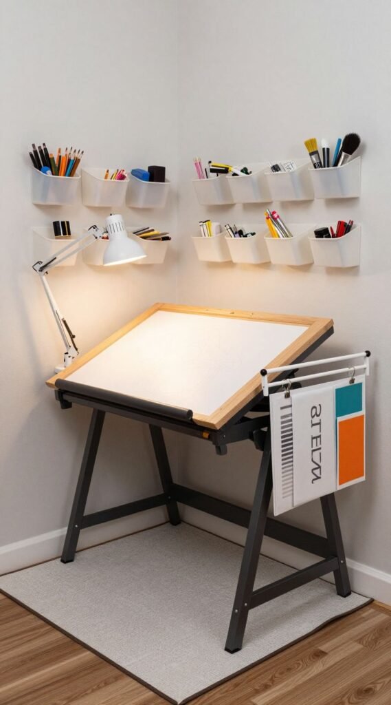 Create a mini atelier. Use a tilting drafting table, clip-on lamps, and wall-mounted cubby bins for supplies. Protect the floor with a washable mat.