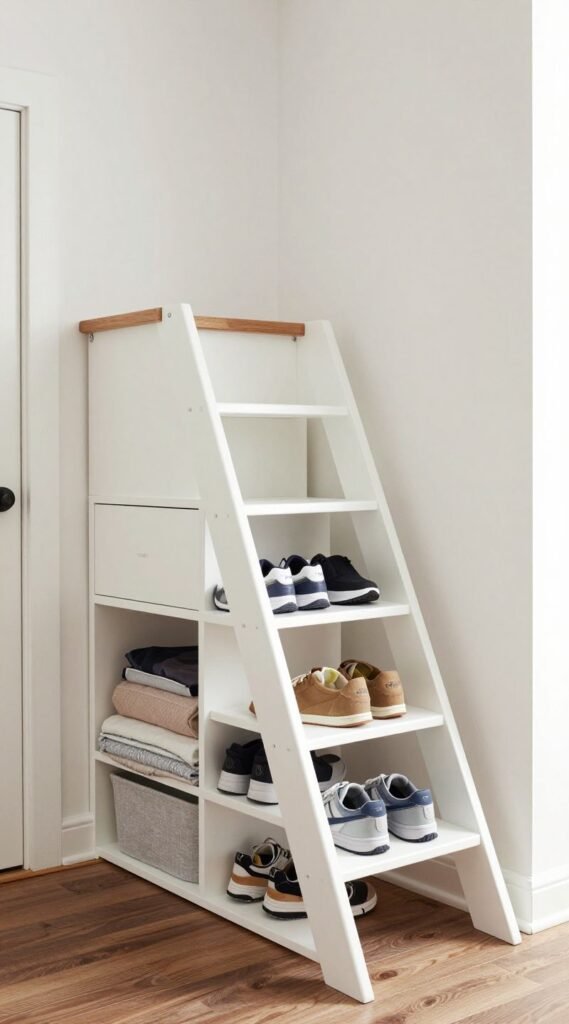 Make your steps work harder. Swap ladders for stair drawers and cubby treads to store shoes, tech, or linens. Add a handrail for stability and style.