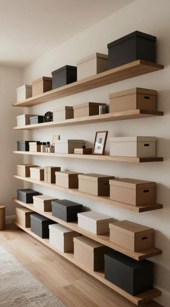 Walls arenโt just for art; theyโre free real estate. Floating shelves stack storage without crowding the floor.