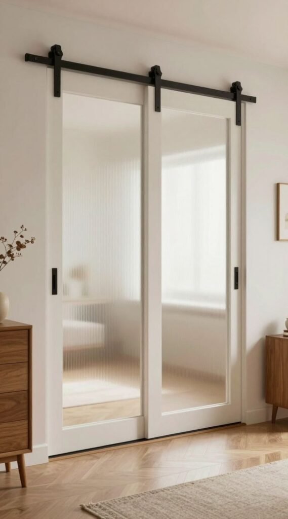 Use frosted glass for light flow while keeping privacy. In rentals, a barn-door track kit keeps it reversible and stylish.