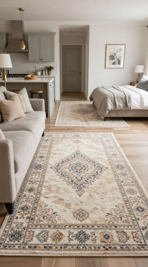 Anchor the sofa on a large area rug, then use a runner for the kitchen lane and a soft rug under the bed. Keep patterns related so it feels intentional.