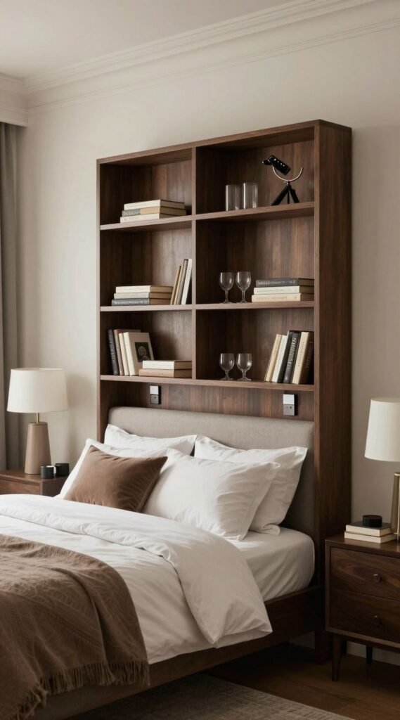 Let your bed do more than nap. A tall headboard with shelves or a mounted ledge hoards books, glasses, and decor.