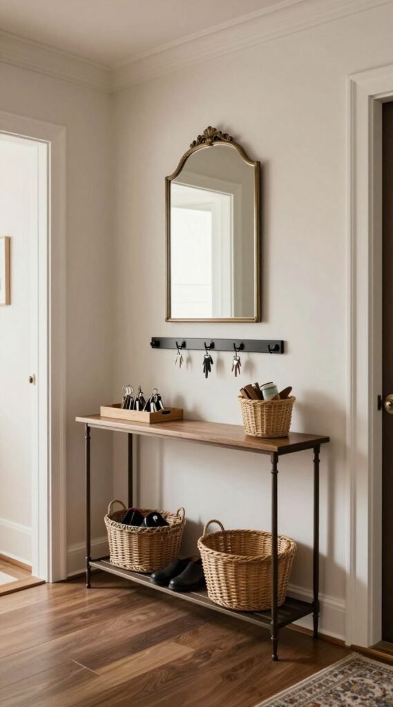 Include a tray for keys, basket for shoes, and a mirror to bounce light and check vibes.