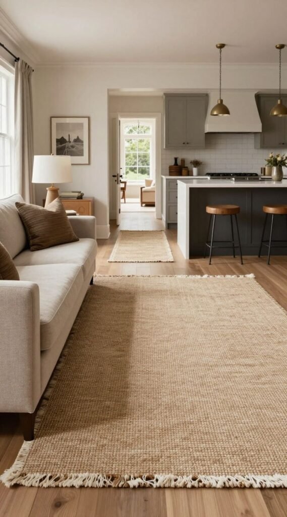 Rugs are your invisible walls without ruining the vibe. Anchor the sofa zone with a large area rug, and use a flatweave runner by the island to define the kitchen lane.
