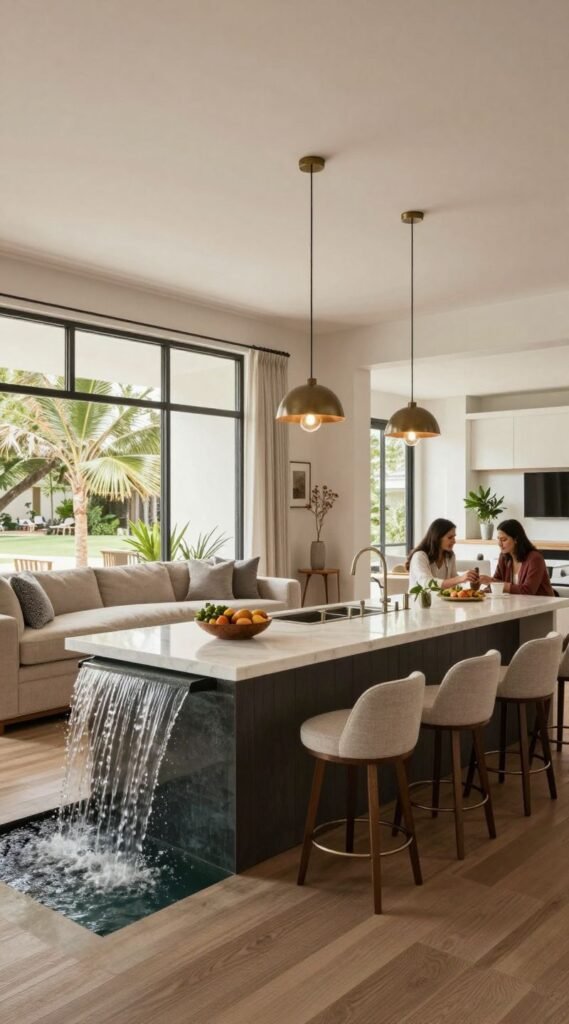 Your island is not just a counter; itโs the VIP lounge. Add comfortable counter stools, choose a waterfall edge for polish, and keep sightlines clear to the sofa.