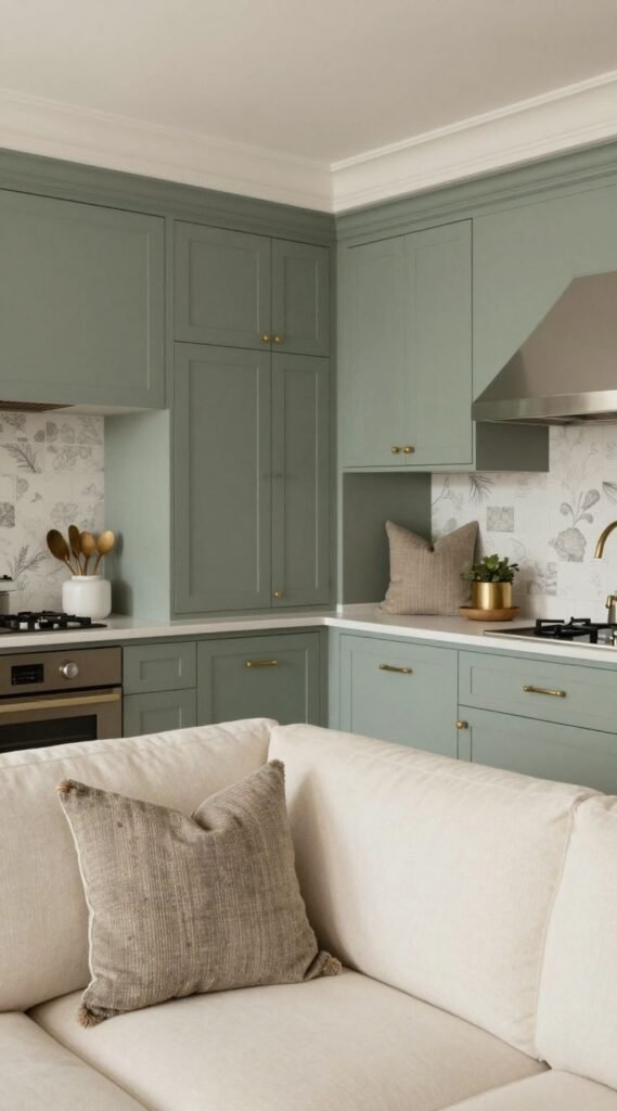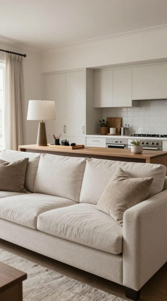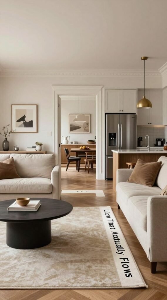 Think sage cabinets, cream sofa, brass hardware mirrored in lamps. Pro tip: Echo the kitchen backsplash tones in throw pillows to tie zones together.
