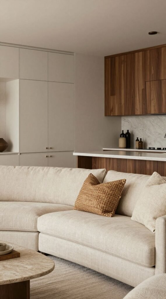Mix textures so the room feels layered, not flat. Pair matte cabinets with a bouclรฉ or linen sofa, and add wood elements for warmth.