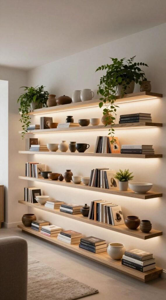 Keep a 60/30/10 mix of books, objects, and greenery for balance. Pro tip: Use LED strip lights under shelves for a soft evening glow.