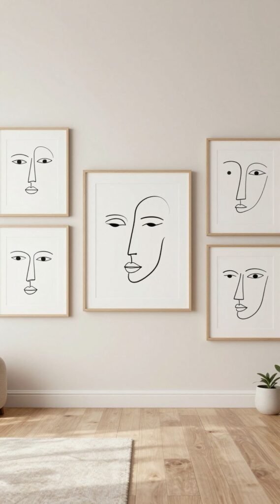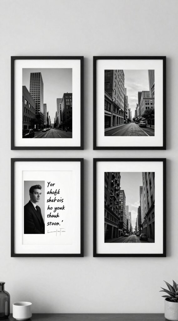 Mix matte prints with thin black frames for depth without clutter. Keep spacing tight for a gallery feel.