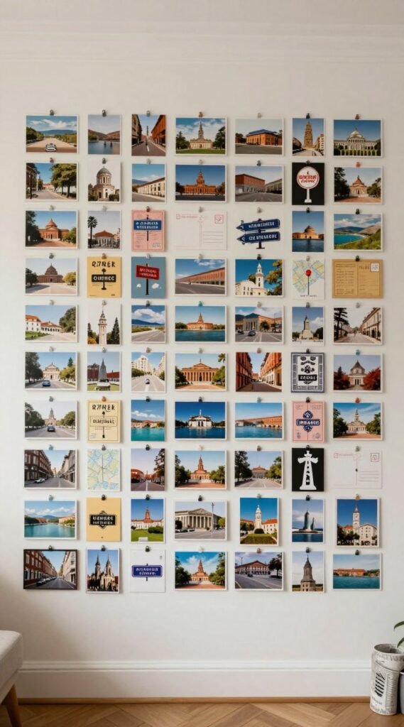 Arrange a tight even grid with washi tape or mini clips. Mix landscapes with street signs and ticket stubs.