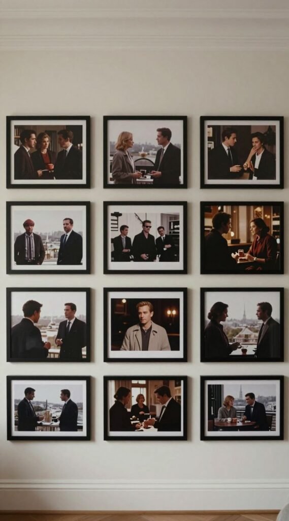 Print stills with wide borders and arrange in a staggered grid. Stick to one director or genre for cohesion.