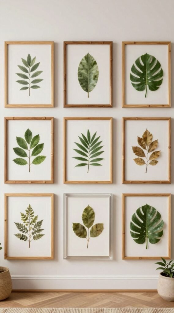 Blend vintage illustrations with macro plant photos. Use oak or bamboo frames for warmth.