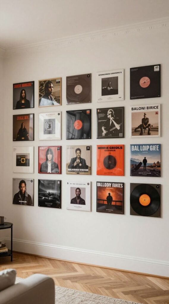 Use 12-inch frames or adhesive sleeves. Mix classics with indie gems and bold typography.