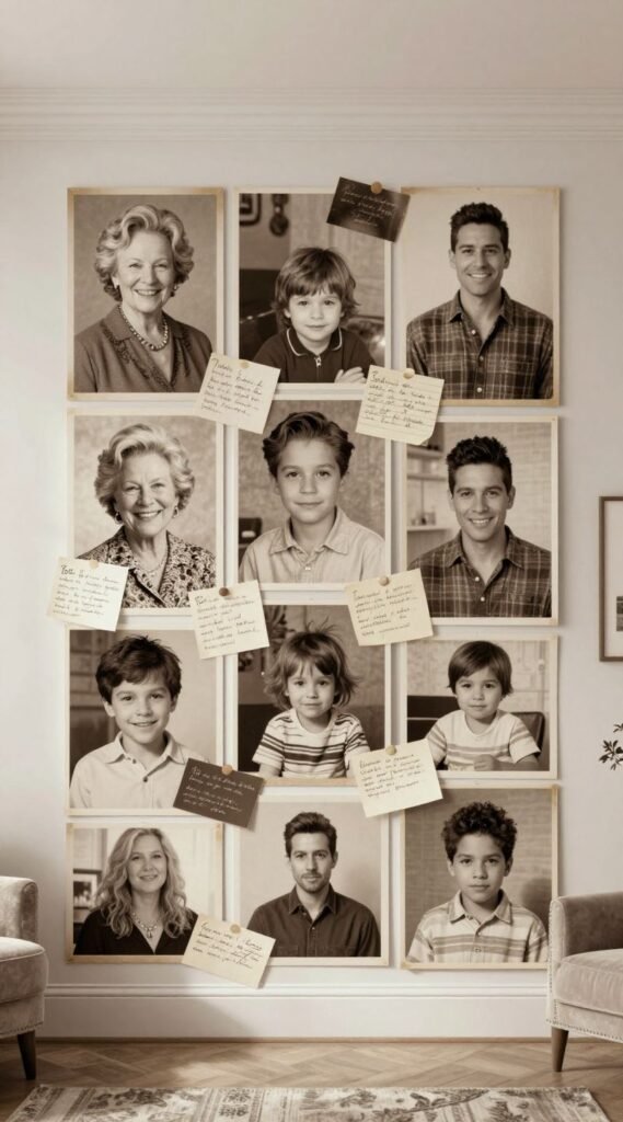 Convert old photos to sepia or black and white for consistency. Scatter a few handwritten notes.
