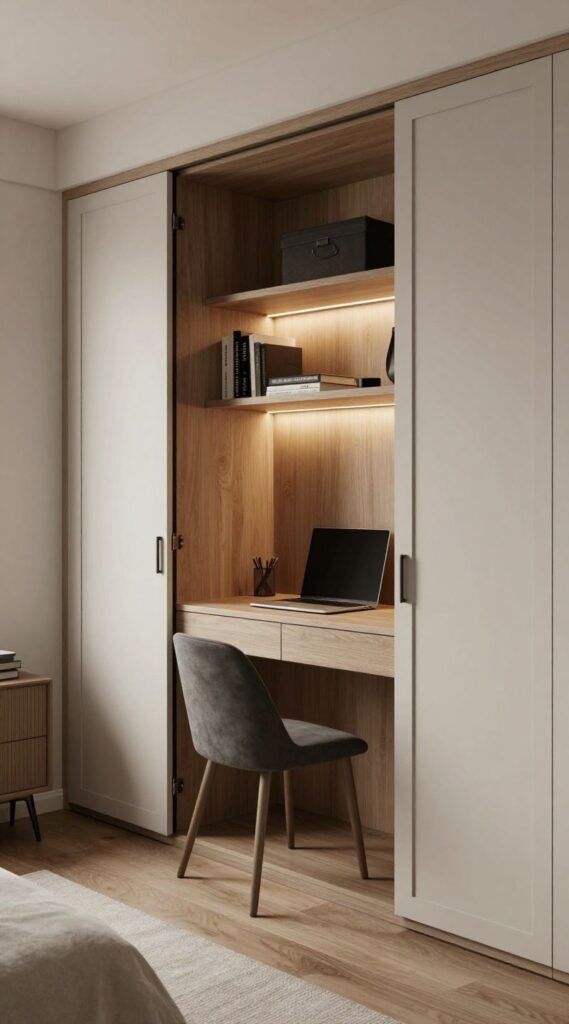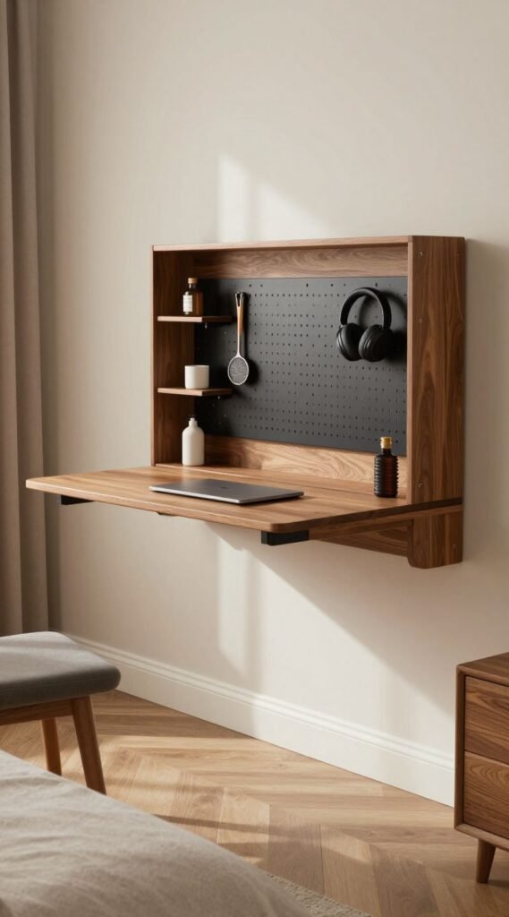 Now you see it, now you donโt. A wall-mounted fold-down desk flips between work mode and life mode in seconds.