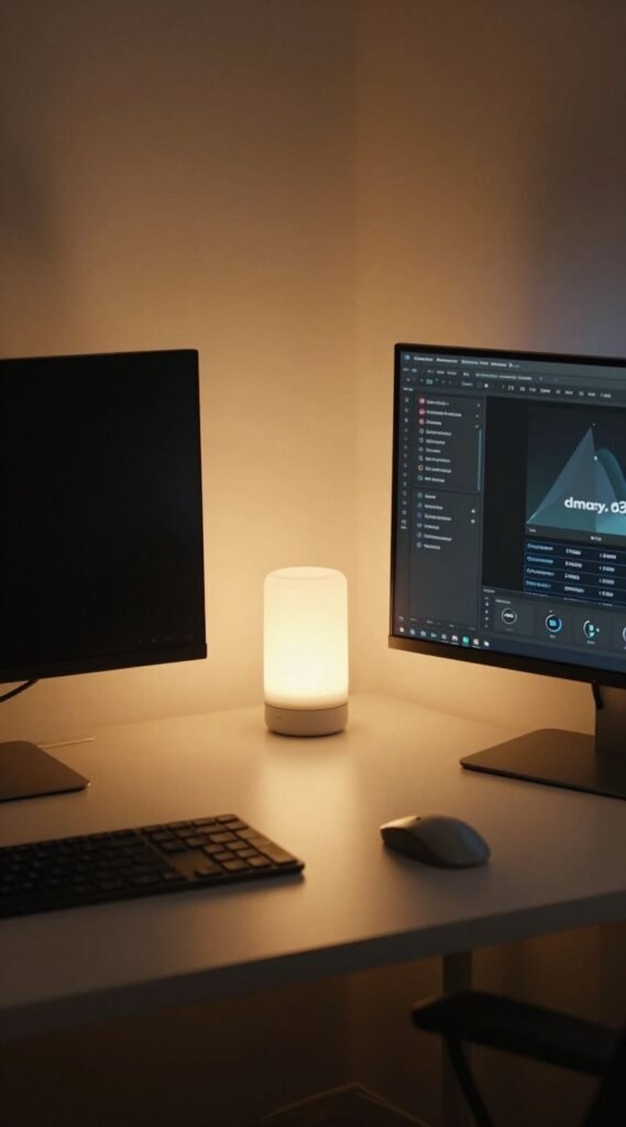 Bad lighting = instant nap. Layered light keeps you focused and flattering on calls.