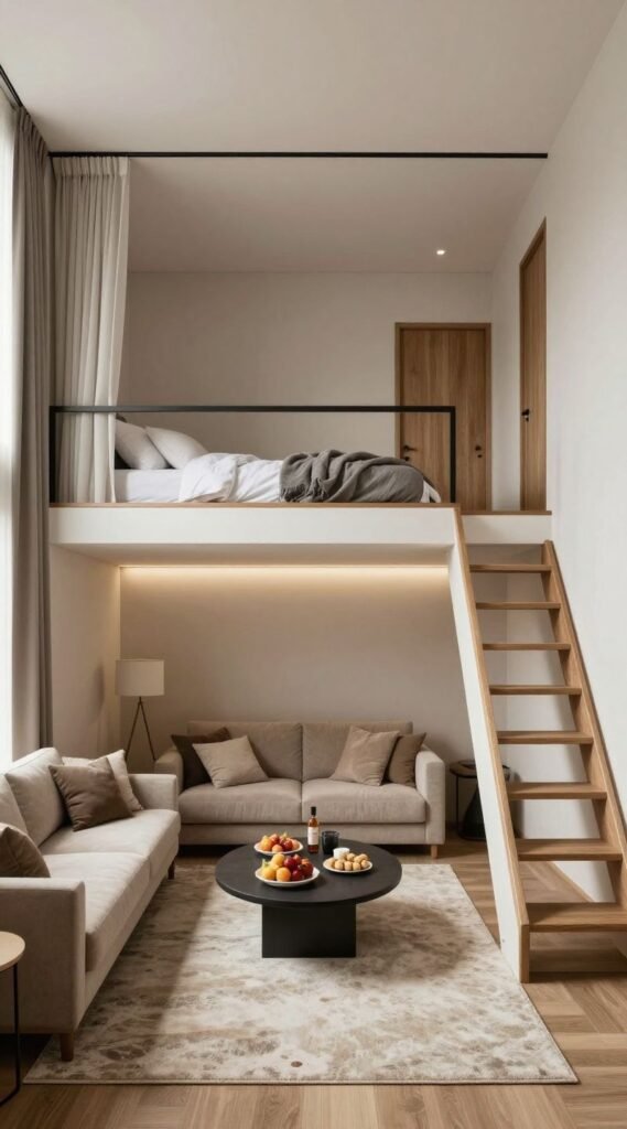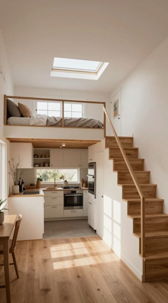 One big room below a sleep loft up top. Itโs the classic tiny house move because it just works. Keep circulation clear and let the vertical space do the heavy lifting.